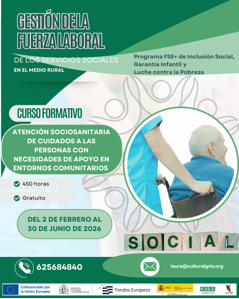 «Gestión de la fuerza laboral de los servicios sociales en el medio rural: mirando hacia el futuro», una operación del Ministerio de Trabajo y Economía Social en el marco del Programa estatal FSE* de Inclusión Social, garantía infantil y lucha contra la pobreza (prioridad 6), impulsado por Coceder y cofinanciado por la Unión Europea y el Ministerio de Derechos Sociales Consumo y Agenda 2030, dentro de los programas de interés social, con cargo a la asignación tributaria del 0,7% del IRPF.